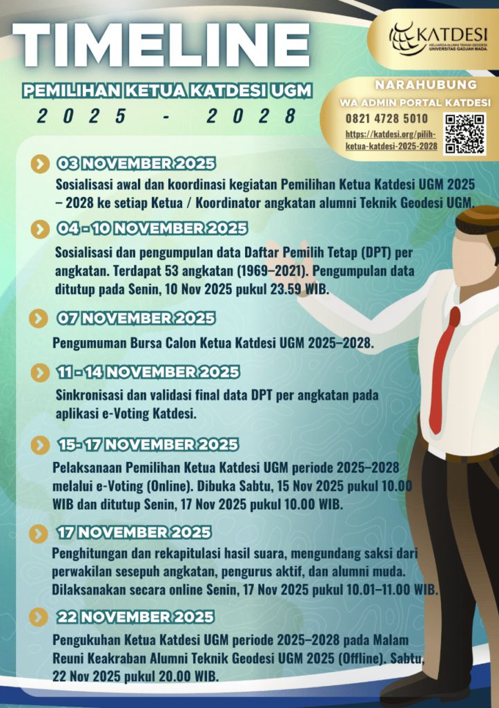 | 15–17 Nov 2025 | Pelaksanaan Pemilihan Ketua Katdesi UGM periode 2025–2028 melalui e-Voting (Online). Dibuka Sabtu, 15 Nov 2025 pukul 10.00 WIB dan ditutup Senin, 17 Nov 2025 pukul 10.00 WIB. |